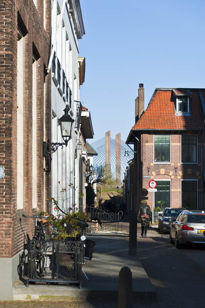 We parkeren aan de Waal en zien meteen al de indrukwekkende brug. Dat is de Martinus Nijhoffbrug. Die ligt er sinds januari 1996. Ik kan me de oude brug ook nog herinneren. Wat een krampending was dat! Rond de Bommelse Brug was het altijd filerijden. Maar nu ligt er de prachtige tuibrug. En is het er nog steeds altijd filerijden…