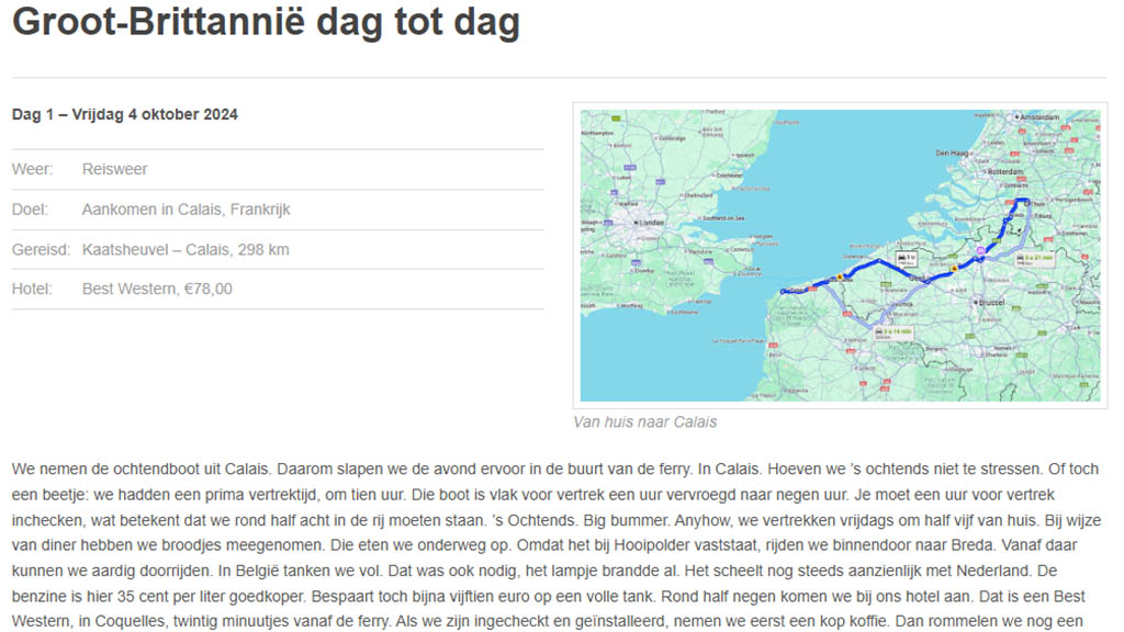 Na twee grote reizen begin dit jaar, blijven we in het najaar van 2024 iets dichter bij huis. We gaan zelfs met eigen auto: naar Groot Brittannië. Dat is een eiland met drie constitutionele landen erop: Engeland, Schotland en Wales. Samen met Noord-Ierland vormen zij het land Verenigd Koninkrijk. We zijn al een paar keer in Engeland geweest en gingen op stedentrip naar de hoofdstad van Schotland, Edinburgh. Nu maken we een compleet rondje over het eiland, met een roadtrip door de drie landen.