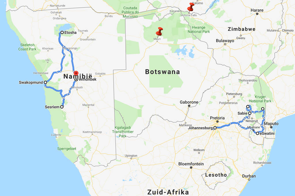 Afrika bestaat uit 54 landen. Dus moeten we kiezen waar we naartoe willen. Hoog op mijn lijstje staat de Okavango Delta in Botswana. Mijn favoriete natuurfotograaf Frans Lanting heeft daar een boek over gemaakt. Maar ook een rondreis door Namibië en Zuid-Afrika lijkt me geweldig. En Andy wil graag de Victoria watervallen zien. Dus ga ik puzzelen. Ik kom op een afwisselende route, die begint in Namibië en eindigt in Zuid-Afrika.
