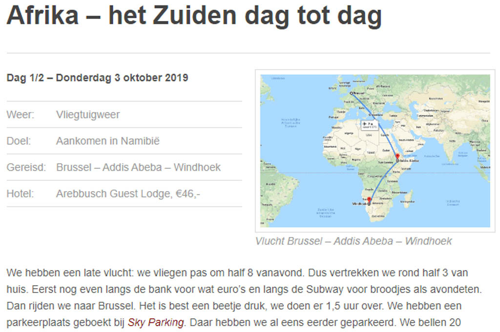 Maar wat blijkt? We hebben wél genoeg voor een enkeltje Namibië! Die tickets zijn normaal behoorlijk aan de prijs. Wij betalen nu slechts 30.000 airmiles + €29,80 per ticket. Terug is ook voordelig: van Johannesburg terug naar Brussel kost ons €552,70 voor 2 enkeltjes. Dat is natuurlijk een koopje. De totale kosten voor alle vliegtickets is dan €1.450,-, voor de autohuur betalen we €850,- en voor de excursies €890,-. Accommodatie is ook allemaal geboekt. Dat is gelukkig prima te doen, qua prijzen.