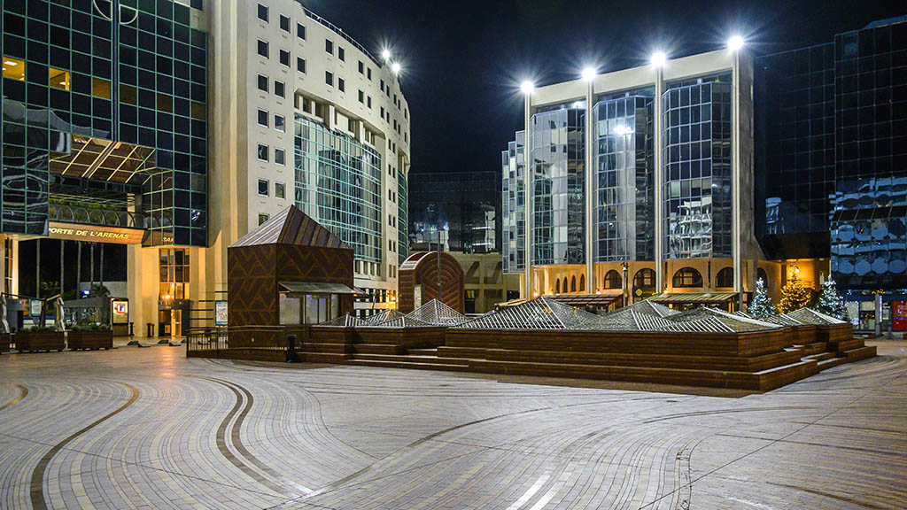 Het heet Tête Carrée en het is eigenlijk een bibliotheek. Maar nu gesloten, want de boel staat hier vooral in de bouwsteigers, weinig te zien verder. Dus lopen we terug naar het plein. We hebben wel zin in koffie. Oe, en crêpes. En in plaats van koffie, chocolademelk. De crêpes laten even op zich wachten en zijn het wachten niet waard. De gevraagde sucre blijkt poedersuiker te zijn. Dat is toch niet hetzelfde. Goed, het is inmiddels vier uur geworden, tijd om terug te gaan. Aan dit plein zit ook onze tramhalte, voor lijn 2 richting het vliegveld en terug naar ons hotel.