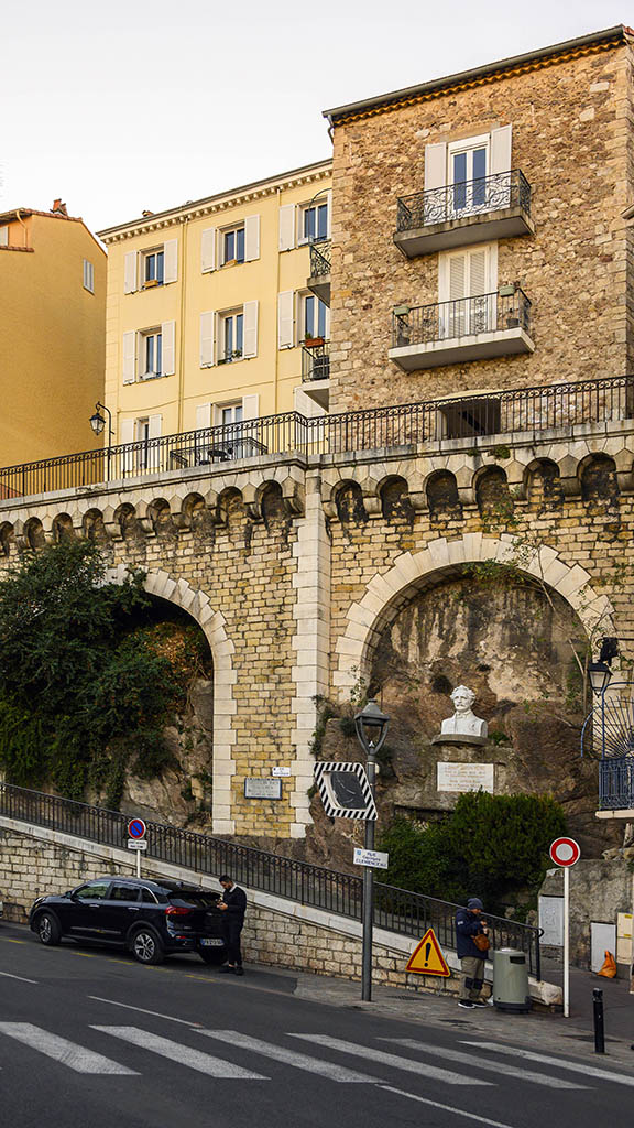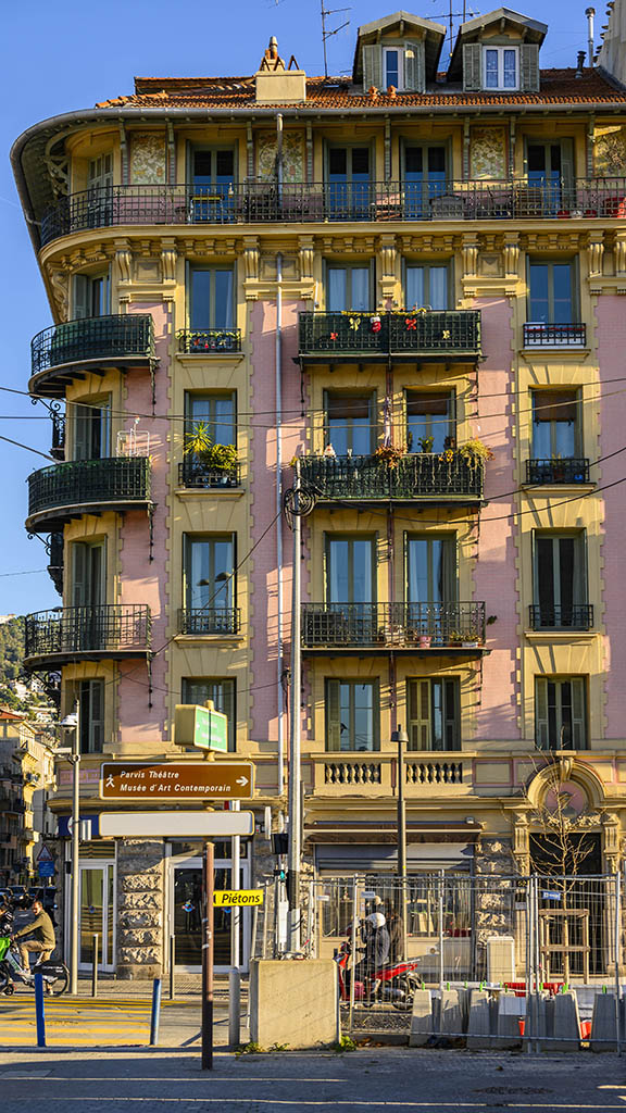 Dat is gewoon een toren met een klok, aan een pleintje. Op het pleintje is een boekenmarkt. En er is een openbaar toilet, ook handig. Tegenover het toiletgebouw is een tramhalte van lijn 1. Daarmee kunnen we naar halte Garibaldi. Place Garibaldi is ook een mooi plein. Vanaf daar wandelen we naar het MAMAC, het modern art museum van Nice. Niet dat we daar naartoe willen; we zijn op weg naar een bijzonder kunstwerk dat erachter ligt: een kubus op de onderkant van een gezicht.