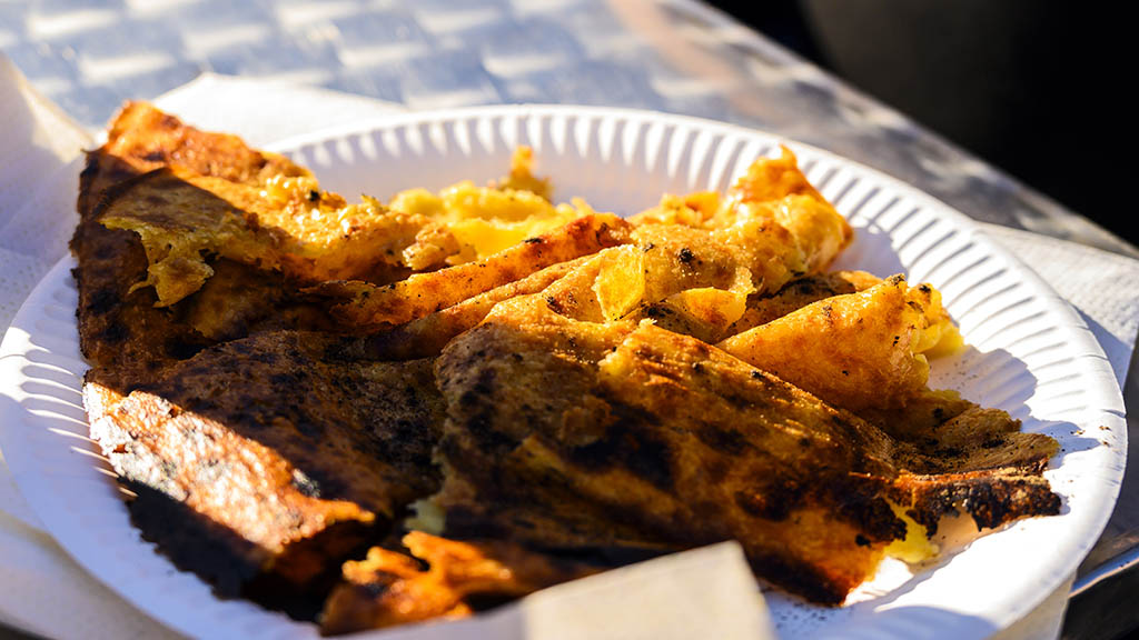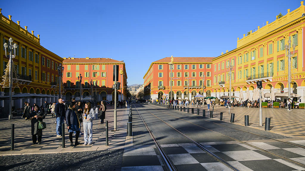 Als de kaart geregeld is, wachten we op lijn 2, die er al snel aankomt. De trams gaan continue, om de zoveel minuten komt er wel eentje langs. We rijden mee tot halte Jean-Médecin. Vanaf daar lopen we naar Place Massena. Eerst de verkeerde kant op, waarom zou Google Maps je meteen goed sturen? Als we dan toch de goede richting hebben gevonden, komen we al snel op het plein. Daar is het gezellig. Er is uiteraard een kerstmarkt en daar verkopen ze socca. Dat is de specialiteit van Nice.