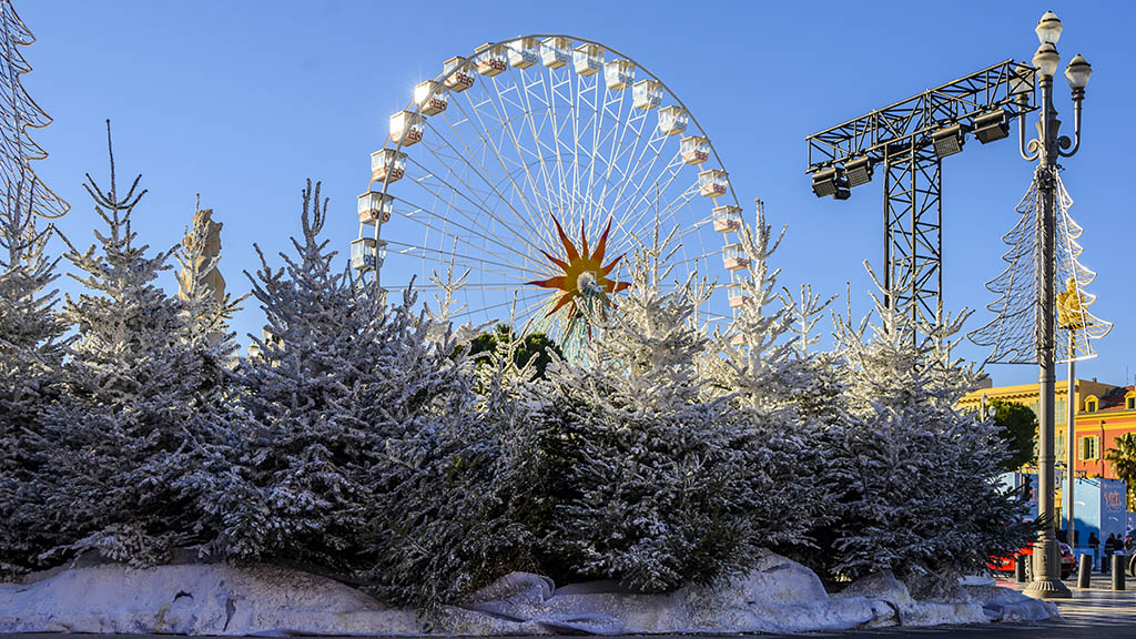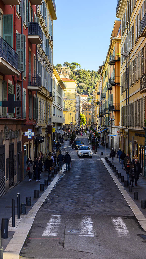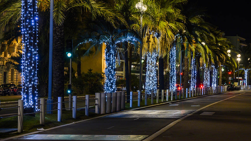 Achter het huizenblok aan de overkant is de zee, aan de Promenade d’Anglais. Daar gaan we de verlichte oude stad bewonderen. Het is niet echt koud, de ijzige wind van de afgelopen dagen ontbreekt gelukkig. Als we zijn uitgekeken, zoeken we de tramhalte op en gaan terug naar het hotel.