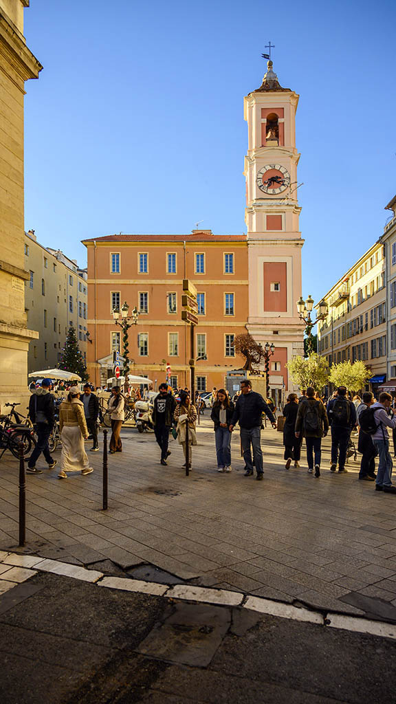 Het is een soort pannenkoek, van kikkererwtenmeel met olijfolie, peper en zout. Het is erg populair, er staat dan ook een aardige rij voor het kraampje. Ik neem een medium portie, zodat we die samen kunnen delen. Het kraampje ernaast verkoopt drinken, zo zijn we compleet. We gaan eens lekker op het bijpassende terrasje zitten, genieten van het heerlijke weer. In de zon kan de jas uit en is het zelfs warm. De socca vinden we niet zo bijzonder. Er zit weinig smaak aan eigenlijk. Als we genoeg gezeten, gegeten en gekeken hebben, wandelen we verder, naar Tour d’Horloge.