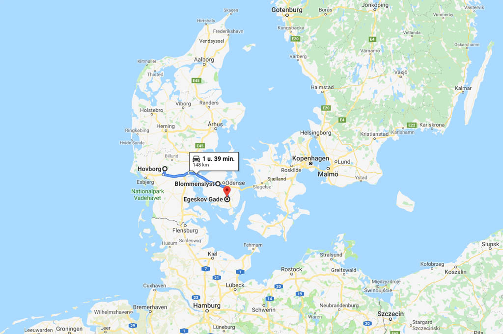 We vertrekken om half 11 uit Kaatsheuvel en arriveren om een uur of 5 op onze eerste bestemming. Dat is Hovborg, op het schiereiland Jutland. Dat ligt aan Duitsland vast en daar rij je in 6,5 uur naartoe.