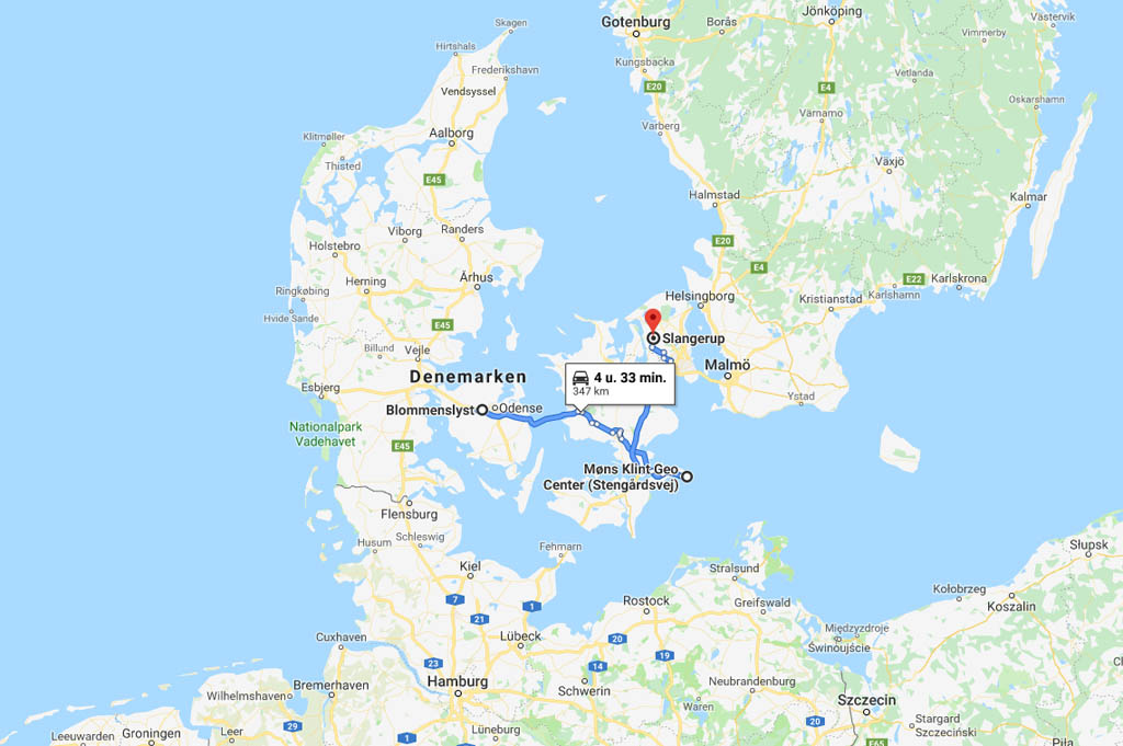 Het schijnt zelfs zo te zijn dat geen enkele plaats in Denemarken verder dan 55 kilometer bij water vandaan ligt. Veel water, drie verschillende eilanden, dus veel bruggen. Anders kom je nergens. Wij komen aan het begin van de middag aan in Blommenslyst.