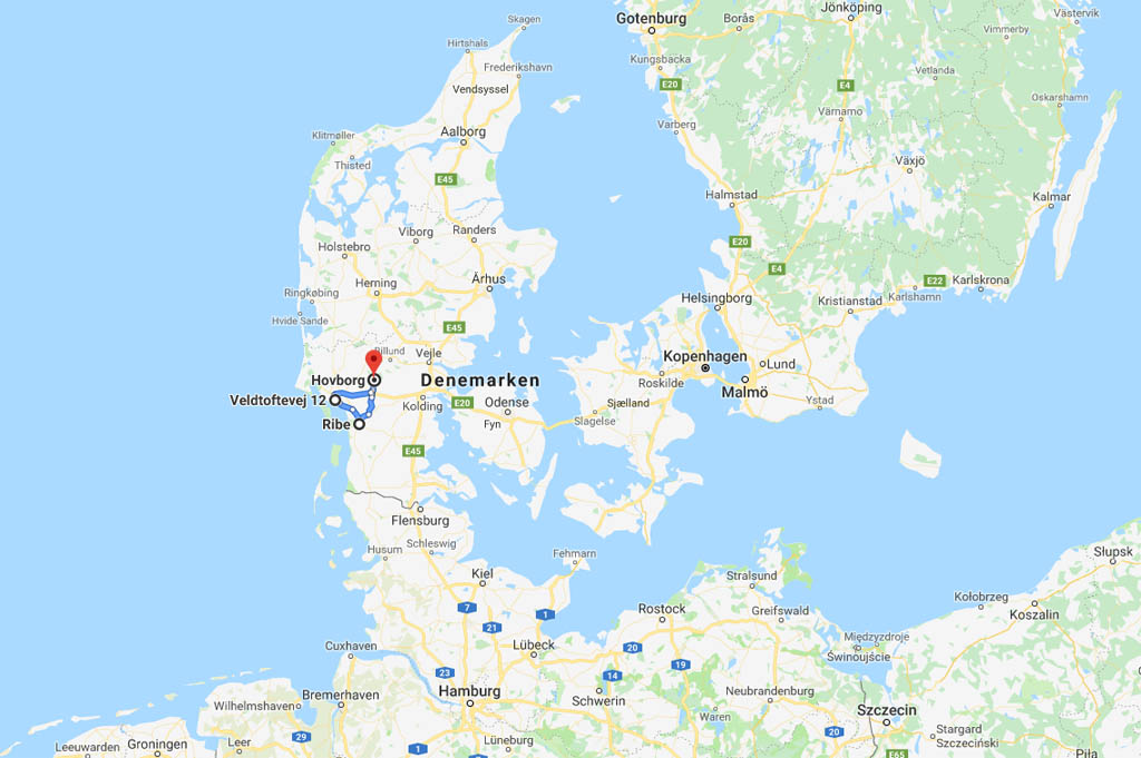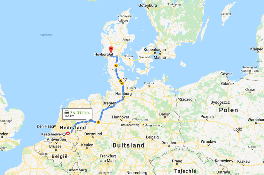 We vertrekken om half 11 uit Kaatsheuvel en arriveren om een uur of 5 op onze eerste bestemming. Dat is Hovborg, op het schiereiland Jutland. Dat ligt aan Duitsland vast en daar rij je in 6,5 uur naartoe.