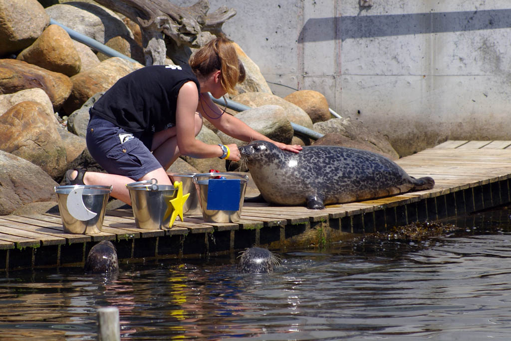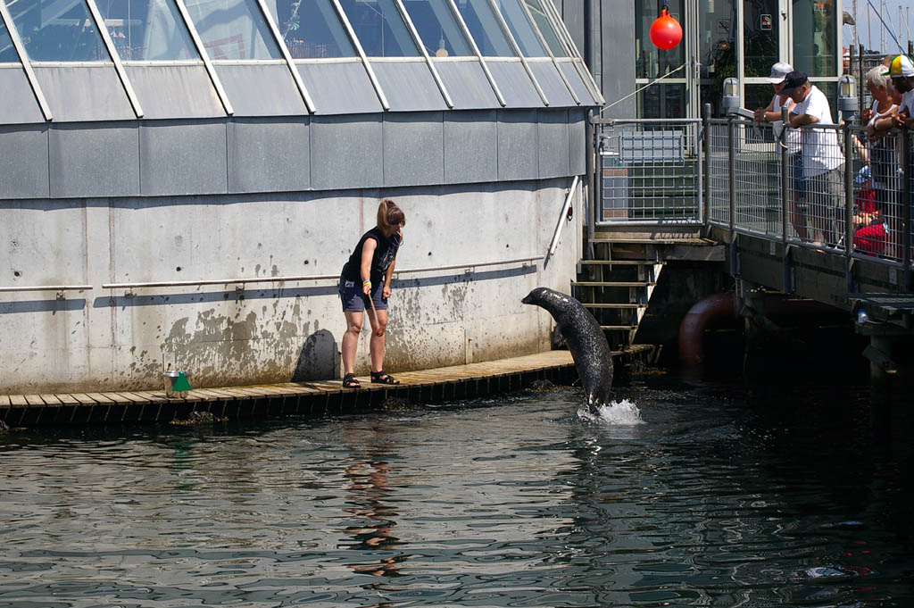 Er is van alles te doen. Zo kunnen we kijken hoe de ik-weet-niet-hoe-ze-heten-vissen gevoerd worden. En de zeehondjes. Als dank vertonen de zeehonden kunstjes, altijd leuk.