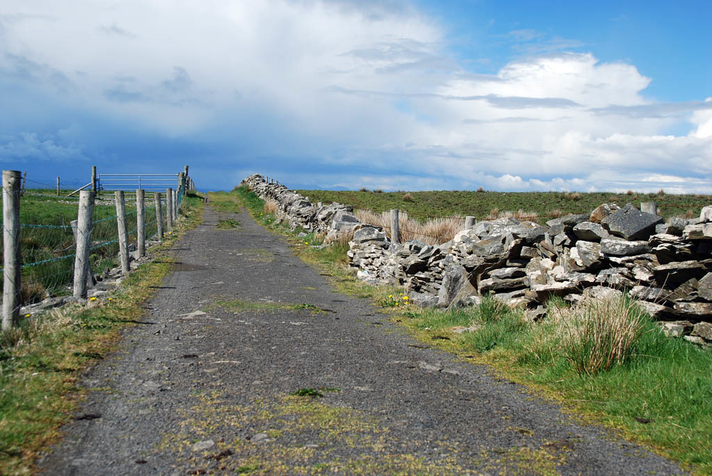 In Ierland moet je die weg soms delen met anderen. Andere wezens. Vandaag zijn dat koeien. En een hond. En een boer.
