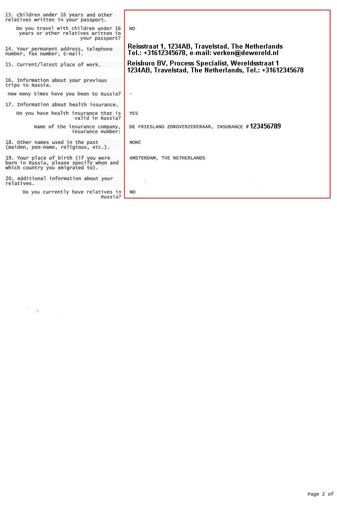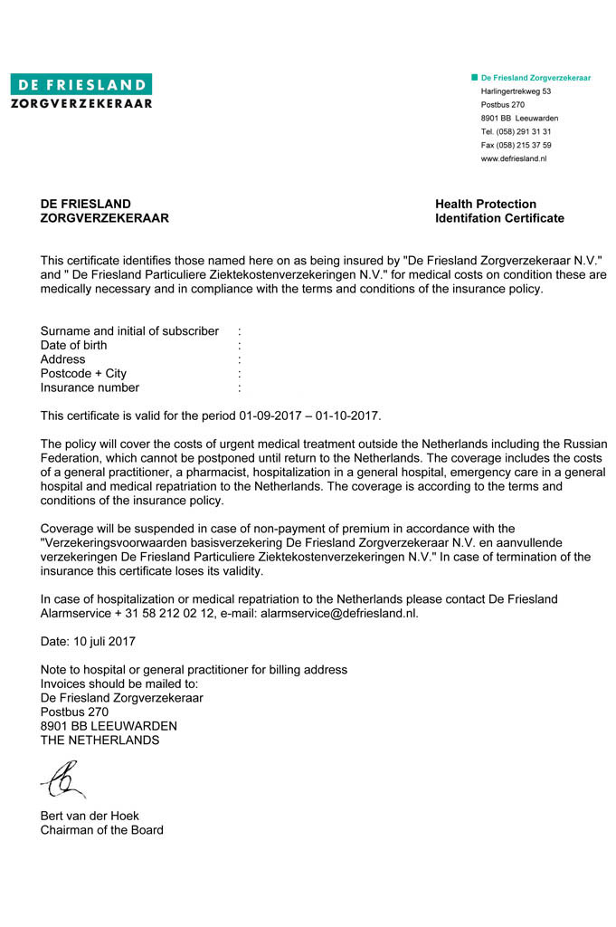 De 2e eis die Rusland heeft is dat je een bewijs toont dat je verzekerd bent in Rusland. Dus vragen we een verklaring op bij onze zorgverzekering. Geen probleem, zijn ze gewend en we krijgen het bewijs gratis toegestuurd. Nu kan ook het Russische aanvraagformulier worden ingevuld.