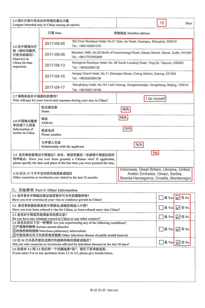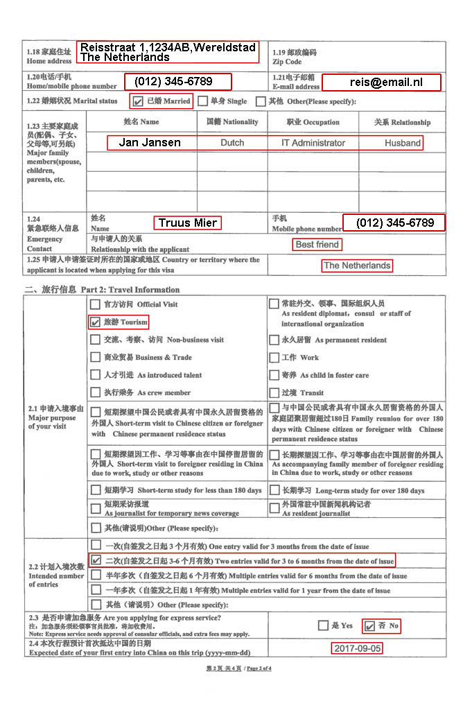 Goed, dan kunnen de aanvragen ingevuld worden. En dat is nog een klus! Voor China moeten 4 pagina’s aan vragen ingevuld worden. Op zich niet heel ingewikkeld. Tot de vraag komt welke andere landen we de afgelopen 12 maanden hebben bezocht…. Hmm, dat zijn er dus nogal wat. Waaronder een aantal islamitische landen. Gelukkig zit Turkije er niet bij, daar waren we een jaar eerder. Want om een of andere reden vinden ze in China Turkije niet zo leuk. Als je daar een stempel van in je paspoort hebt, mag je uitleggen wat je er te zoeken had. Gelukkig is RM Express goed bereikbaar en ik bel even om te overleggen. We besluiten om alleen die landen te vermelden waar we fysiek door de douane zijn gegaan en waarvan we een stempel in onze paspoorten hebben.
