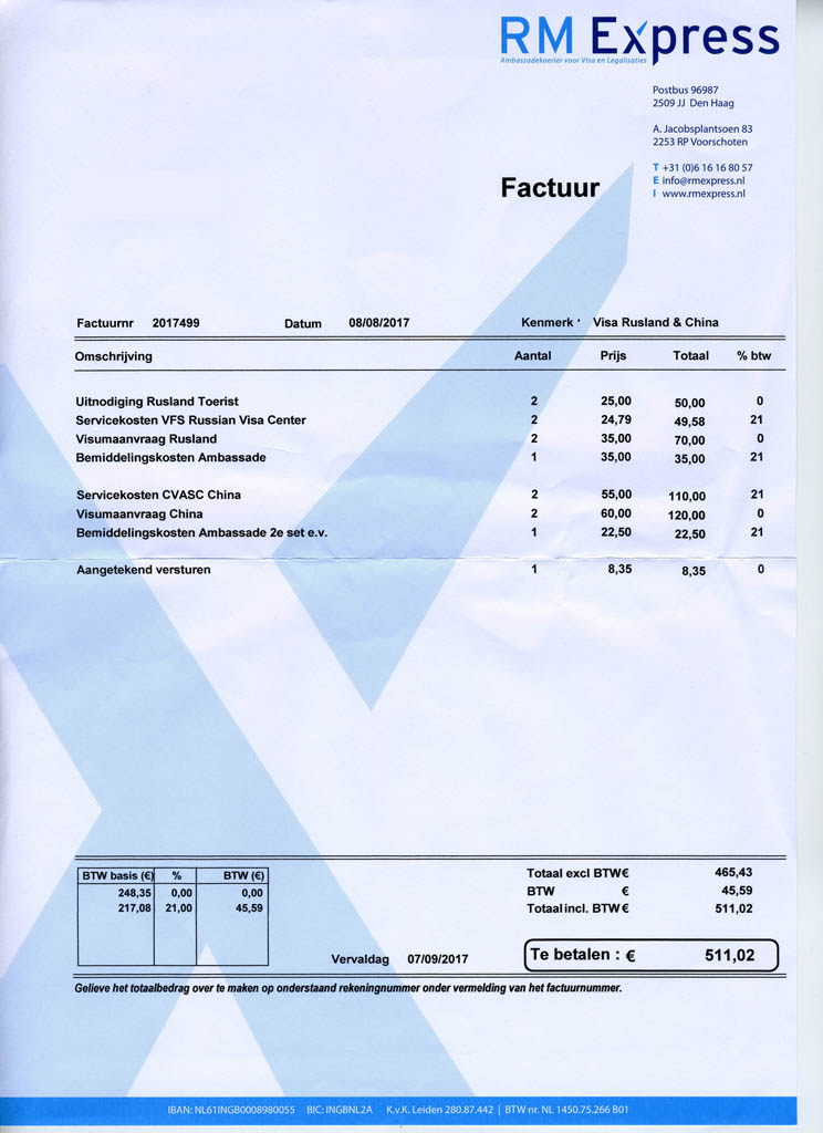 Op een daarvan kom ik de tip tegen om voor de visa RM Express in te schakelen. Dus maar eens op hun site gekeken. Ah, dat is handig: ze kunnen alle visa voor ons afhandelen. En de kosten vallen heel erg mee: €35,- voor het eerste visum, €22,50 voor het volgende. En dat is voor beide visums samen. Kijk, daarvoor gaan we dus niet zelf 2x naar elke ambassade rijden. Ik zoek contact met Ron & Froja van RM Express om het te regelen. Voor de totale prijs van €470,37 zijn we klaar. Dat is €130,- voor 2 Russische visa, €253,10 voor 2 Chinese en €87,27 aan kosten (bemiddeling en 2x aangetekend versturen).