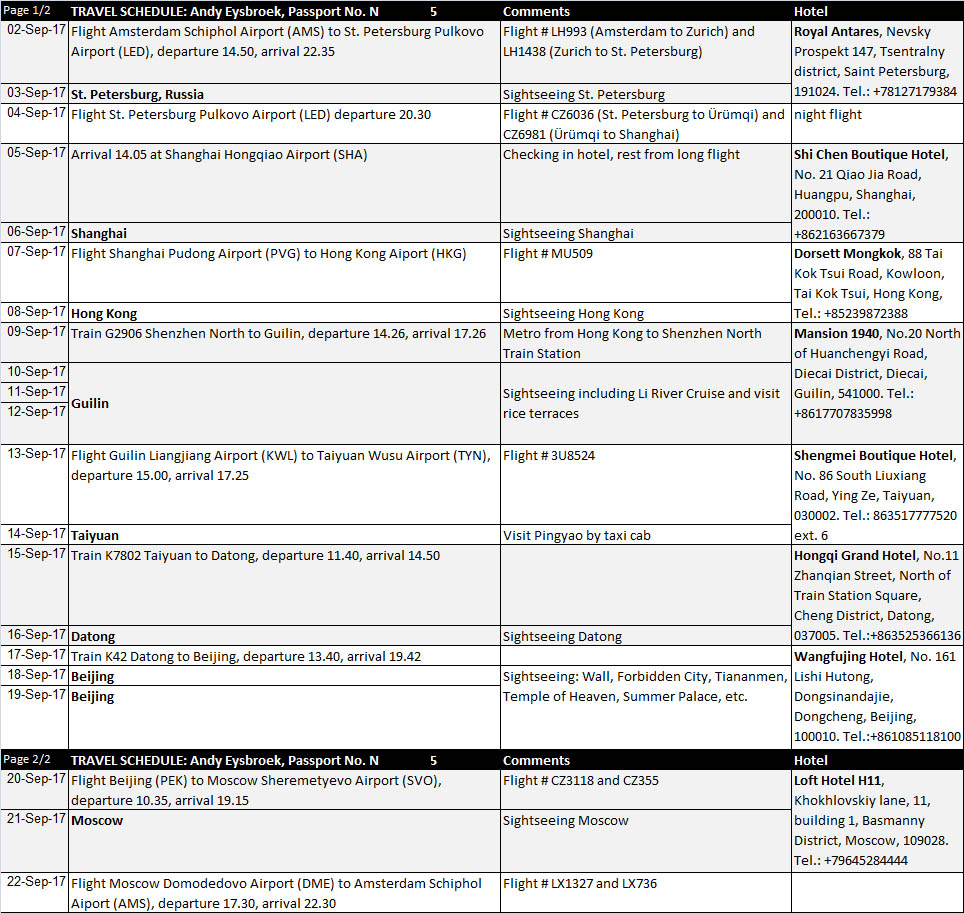 Dan moet het overige papierwerk erbij gescharreld worden. We moeten een gedetailleerd reisschema meesturen. Geen punt, knutselen we even in elkaar. Dan van alle vluchten en treinreizen de tickets. No prob, printen we even uit. Oh wacht, we hebben nog niet de werkelijke treinkaartjes. Maar wel de offerte van het bureau dat die kaartjes voor ons gaat regelen. Dus print ik dat bewijs uit. En van alle hotelboekingen de bevestigingen. Ook al niet lastig, want ik heb alles bij Booking.com geboekt. Daar kun je de reservering uitprinten in de taal van het land. Reuze handig dus.