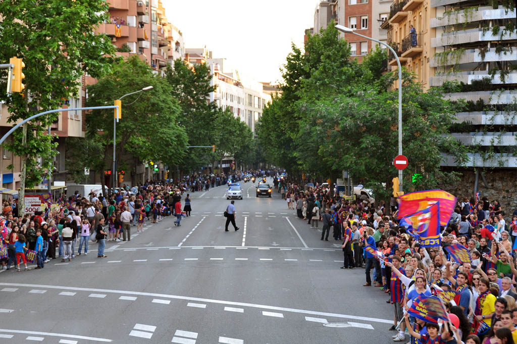 Tijdens ons bezoek wordt Barça – FC Barcelona natuurlijk – gehuldigd voor het winnen van de een of andere titel. Ze maken daarom een rondrit door de stad en eindigen in het voetbalstadion. Langs de route begint het vol te lopen met blauw-rode mensen, de kleuren van de club. Daar moeten wij met onze open hop-on bus doorheen.
