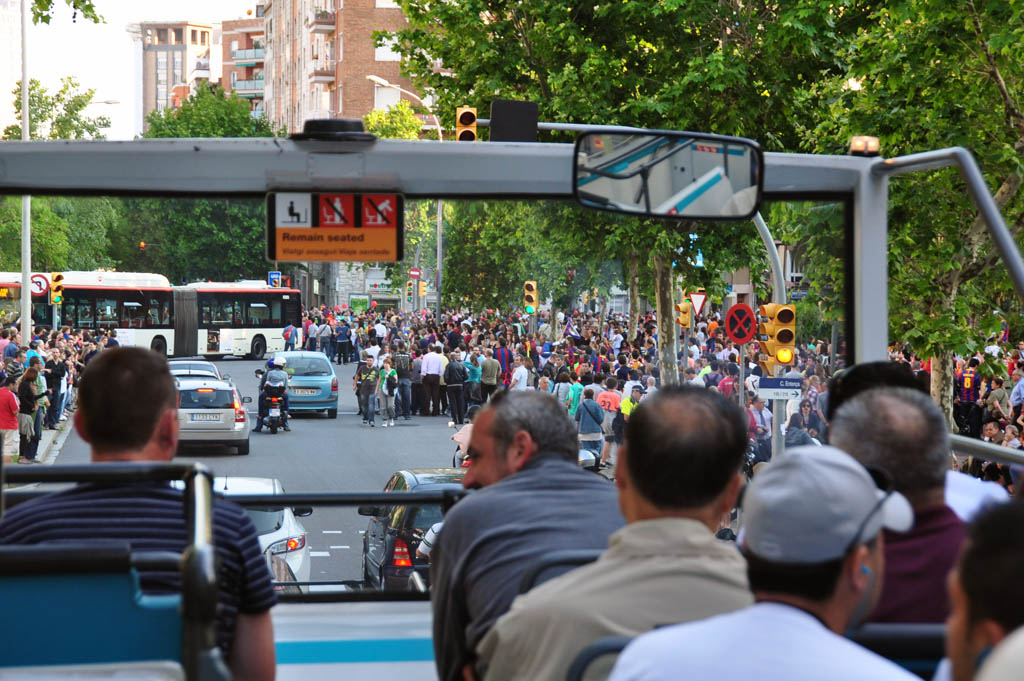 Tijdens ons bezoek wordt Barça – FC Barcelona natuurlijk – gehuldigd voor het winnen van de een of andere titel. Ze maken daarom een rondrit door de stad en eindigen in het voetbalstadion. Langs de route begint het vol te lopen met blauw-rode mensen, de kleuren van de club. Daar moeten wij met onze open hop-on bus doorheen.