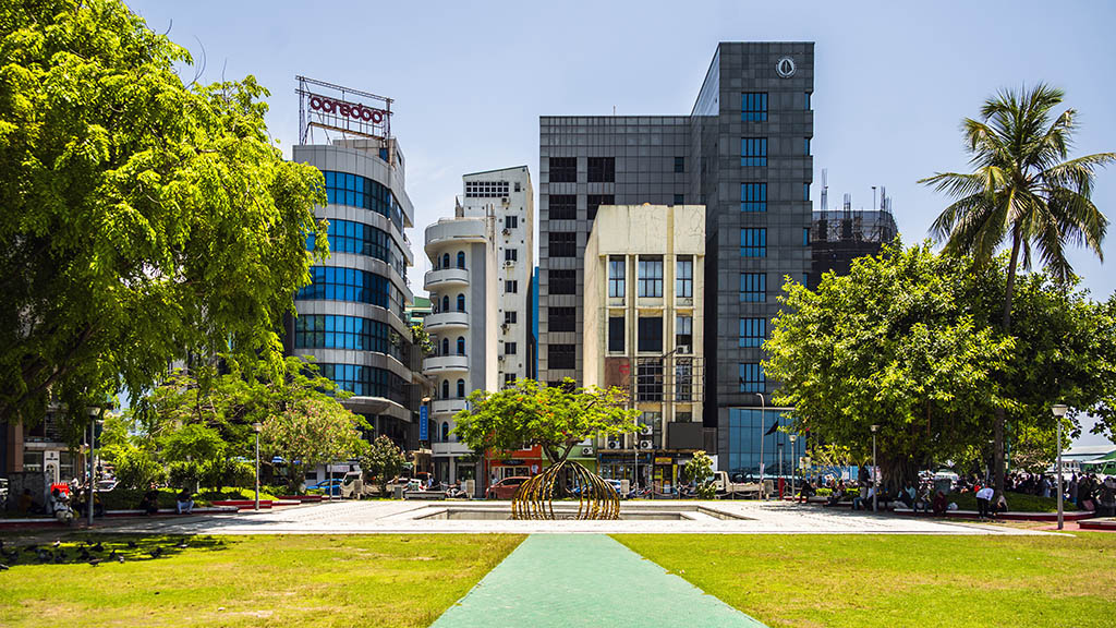 Richting de zee kom je eerst langs de nieuwe moskee, met de makkelijk te onthouden naam Masjid al-Sultan Muhammad Thakurufaanu al-Auzam. Was de oude moskee in 1658 opgeleverd, deze stamt uit 1984. Ietsje jonger. We lopen door en komen dan op het Republic Square. Of, in goed Maldivisch, Jumhooree Maidhaan. Google weet maar weinig te vertellen over dit plein. Wat ik weet is dat het indrukwekkende gebouw dat aan de ene kant staat, het hoofdkwartier van de politie is. Het is vernoemd naar een soldaat, die tijdens de staatsgreep in 1988 omkwam: Hussein Adam.