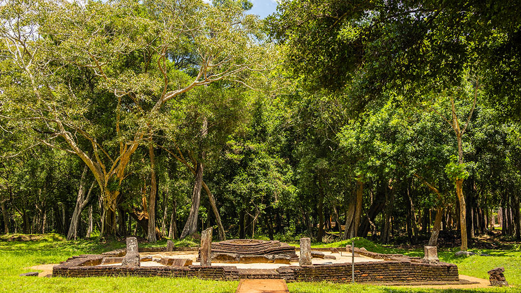 We stappen weer in de tuktuk en rijden naar de volgende plek. We moeten een kleine trap op en komen op een veld met diverse ruïnes. De mooiste is Vatadage. Middenin deze ruïne zit een Boeddha te zitten. Verderop zien we Hatadage en Thuparama, dat deels in de steigers staat. We gaan verder, naar Gal Viharaya. Dat is een grot-tempel met een grote, liggende Boeddha. Het is een klein wandelingetje en dan is er een soort grot.