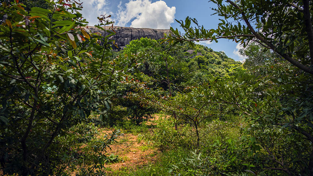 We zoeken daarom een plekje vanaf waar we de rots redelijk goed kunnen zien. Dan rijden we terug naar de hoofdweg. Daar is een plekje langs de weg, vanaf waar we Lion Rock perfect zien liggen. Gelukkig dat we niet die rots hebben beklommen, want zo lukt het dus ook. We zien alleen de leeuwentenen niet. Maar ach, die zijn toch nep. Kushan heeft ons overtuigd om hier in Sigiriya een “Village tour” te doen.