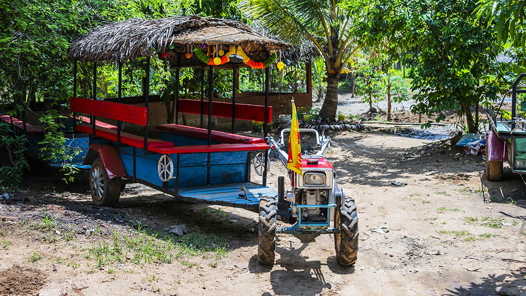 Dat blijk toch wat onhandig, gelukkig zijn er ook lepels. Ik vind het wel lekker, Andy iets minder. We krijgen verse ananas als toetje. We gaan naar ons volgende en laatste transportmiddel: een handtractor met een trekkar. We hebben deze motoren al vaker in andere Aziatische landen gezien. Heel apart om er nu mee gereden te worden. Wij klauteren in de kar, de chauffeur start de tractor en we kunnen op pad.