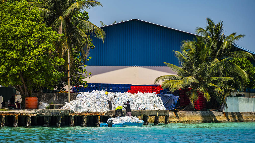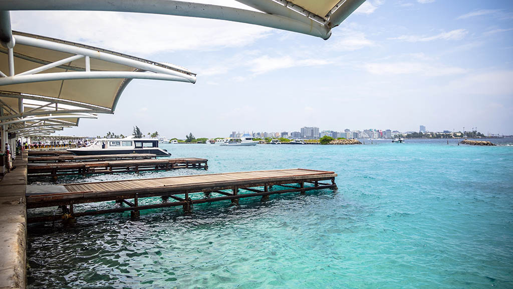 Op het vliegveld kunnen we onze bagage stallen, tegen betaling van 100 rufiyaa per koffer, per dag. Als we van de koffers af zijn, gaan we op zoek naar de kiosk waar we kaartjes voor de ferry naar Malé kunnen kopen. Die kosten 15 rufiyaa per persoon. De overtocht duurt nog geen kwartier. We wachten even op onze boot en tuffen dan rustig naar de overkant. We maken een kleine wandeling over dit eiland, langs een aantal bezienswaardigheden.