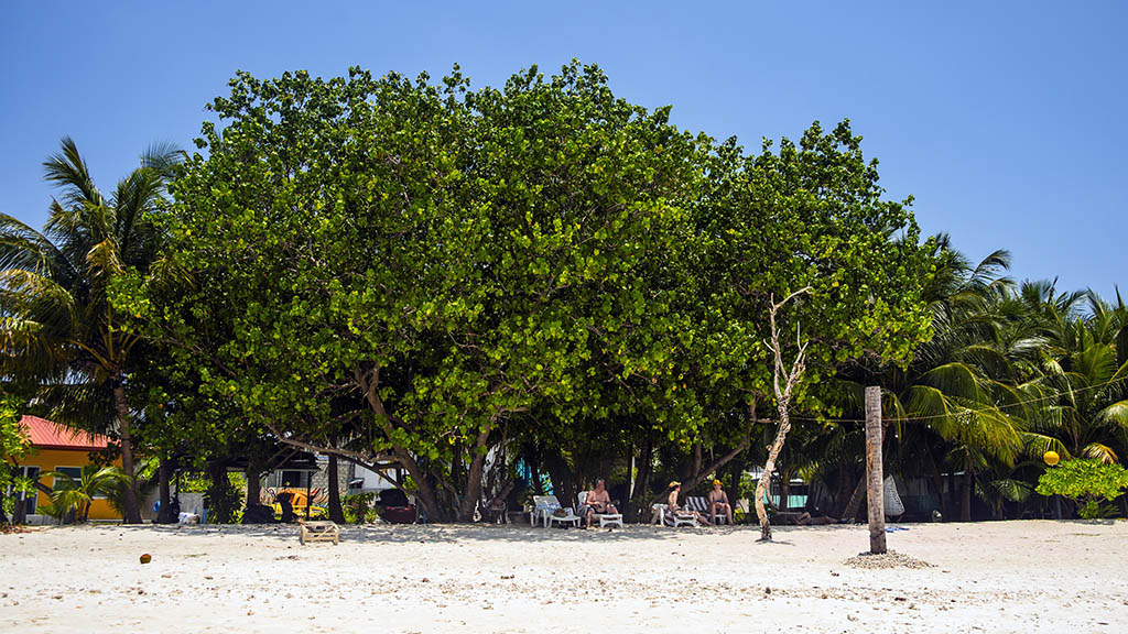 De Malediven zijn hoofdzakelijk Islamitisch. Het is daarom niet de bedoeling dat je maar overal in je bikini en witte lijf gaat rondsjouwen en zwemmen. Je hoort schouders en knieën te bedekken. Waar de meeste toeristen zich niets van aantrekken; er zijn er maar weinig die aan die standaard voldoen. Net als op elk Maledivisch eiland is er een speciaal bikini beach. Daar kun je je gang gaan. En dat doen we. We vinden twee strandbedden in de schaduw. Daar leggen we de van Rafiq meegekregen strandlakens op en duiken dan snel het water in. Dat is heerlijk! We wisselen dobberen in het water af met opdrogen in de schaduw.