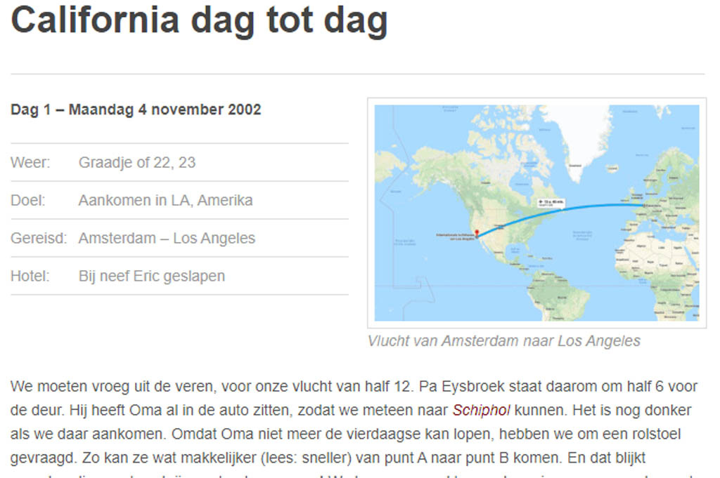 Naar het reisbureau dus. Oma heeft te kennen gegeven dat ze alleen met KLM wil vliegen. Die vliegt rechtstreeks op Los Angeles, onze bestemming. We krijgen tickets aangeboden van €540,- per stuk en die nemen we. We hebben in Amerika ook een auto nodig. Ik duik daarom op het Internet en kom uiteindelijk uit bij Thrifty, waar ik een intermediate car boek. Ik schaf nog wat reisgidsen aan, ga me inlezen over California en kom uiteindelijk met een plan.